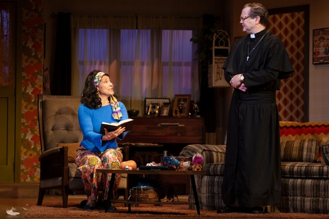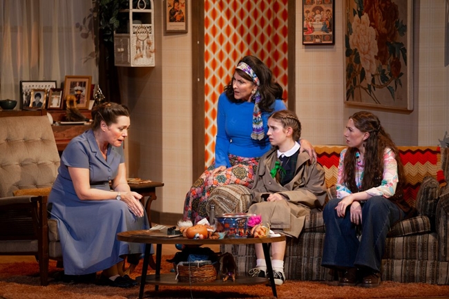 It’s not about a convent. Incident at Our Lady of Perpetual Help is a family comedy, and a family drama, set in a family home, and centered on Linda (Autumn Eliza Sheffy), a teen girl in the 1970s caught between the past (her church, her father) and the future (her aunt, her younger sister, and her own life ambitions). The play absolutely draws you in. With 15 seconds you are captivated. The entire play is set in the living room of a family home, with everyone frozen as if in an old photograph. Then Linda walks through the room, bringing each to life with a touch.